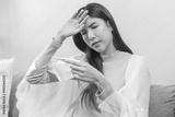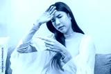 Sick, influenza asian young woman, girl headache have fever, hand touching forehead, holding thermometer for check measure body temperature, illness while sitting rest on sofa at home. Health care.