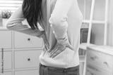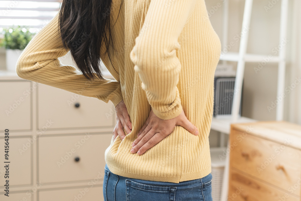 Pain body muscles stiff, suffering asian young woman, girl painful with back pain, back ache standing from work at home holding massaging rubbing shoulder hurt, sore. Health care and medical concept.