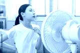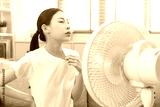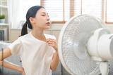 Suffer summer heat wave stroke, hot weather, tired asian young woman sitting on couch in living room without air-conditioner, using electric fan, wave fan to cool for ventilation when high temperature