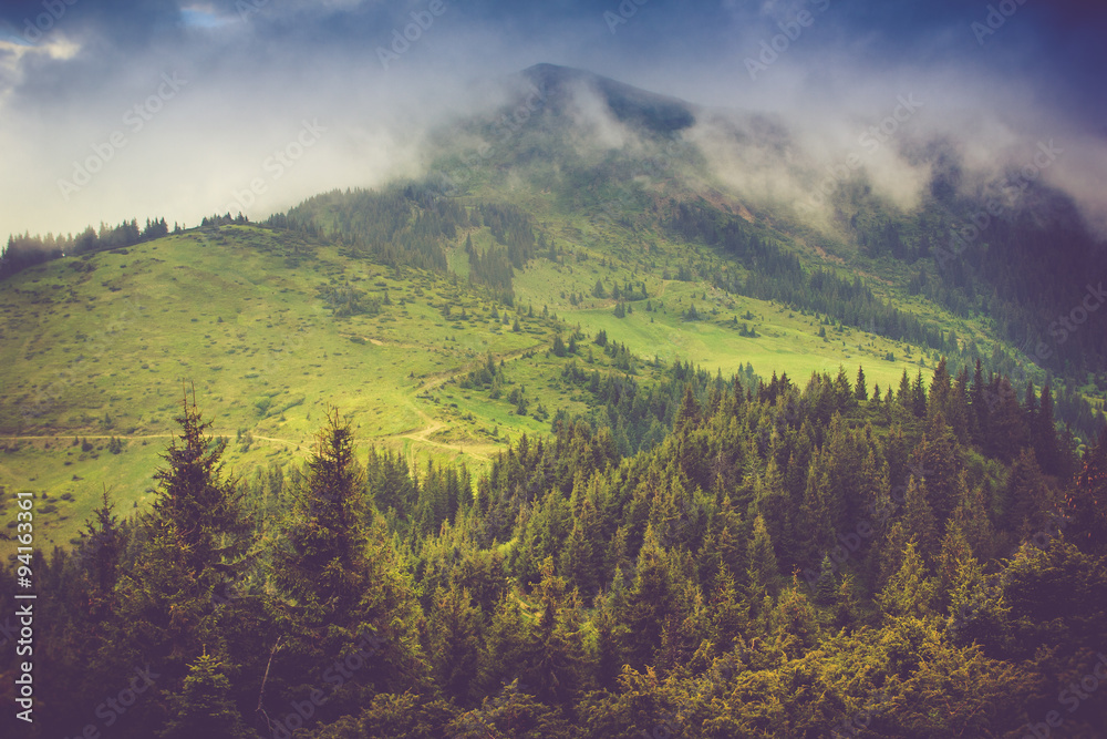 Mountain landscape and forests tops covered with mist. Dramatic overcast sky.