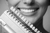 Smiling woman with teeth color samples on beige background, closeup. Dental veneers