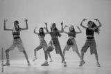 Group pf girls, dancers dancing dressed stylish sport, casual outfits in neon light against gradient pink background. Concept of sport and hobby, childhood, friendship, motion. Dance school.