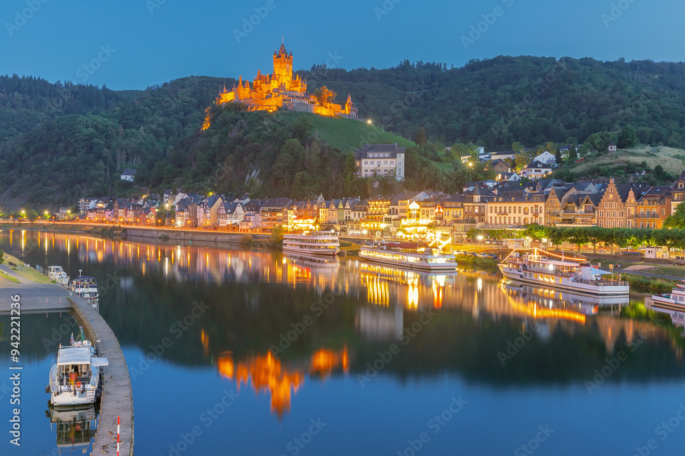 Cochem at night, beautiful town on romantic Moselle river, Reichsburg castle on hill, Germany