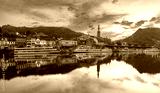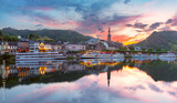 Sunset view of Cochem with Saint Martin Church, colorful buildings, and reflections, Germany