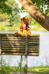 A happy golden retriever smiles with his tongue hanging out while playing outside in the green grass on a beautiful summer day