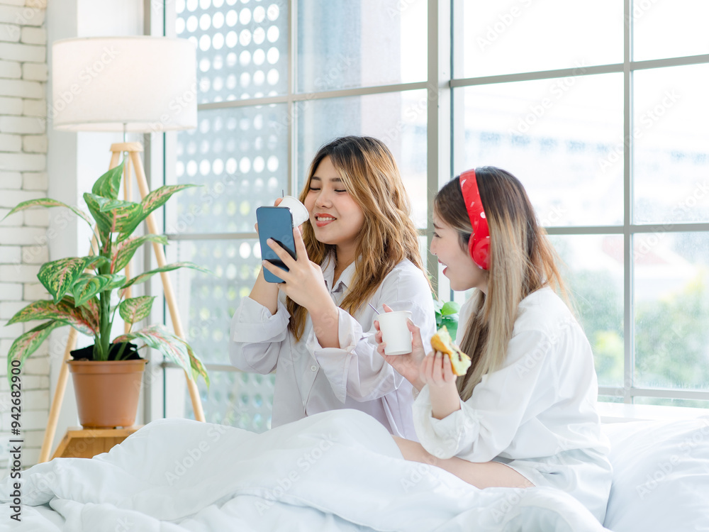 Two beautiful people happy Asian females drinking hot coffee or tea with bread or cake. Pretty woman laughing and talking relaxed funny on a white bed, Concept teenage or friends lifestyle at home.