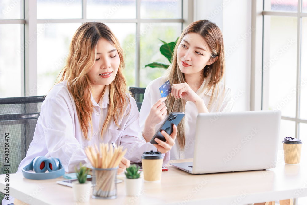 Two happy women, a beautiful Asian female using a computer laptop smiling while shopping online, and a credit card in the living room. Concept teenage or friends, time together lifestyle at home.