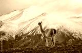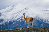 Guanaco in the stands on the crest of the mountain backdrop of snowy peaks. Torres del Paine. Chile. An excellent illustration.