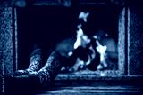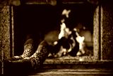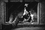 Feet in woollen socks by the fireplace. Woman relaxes by warm fire and warming up her feet in woollen socks. Close up on feet. Winter and Christmas holidays concept.