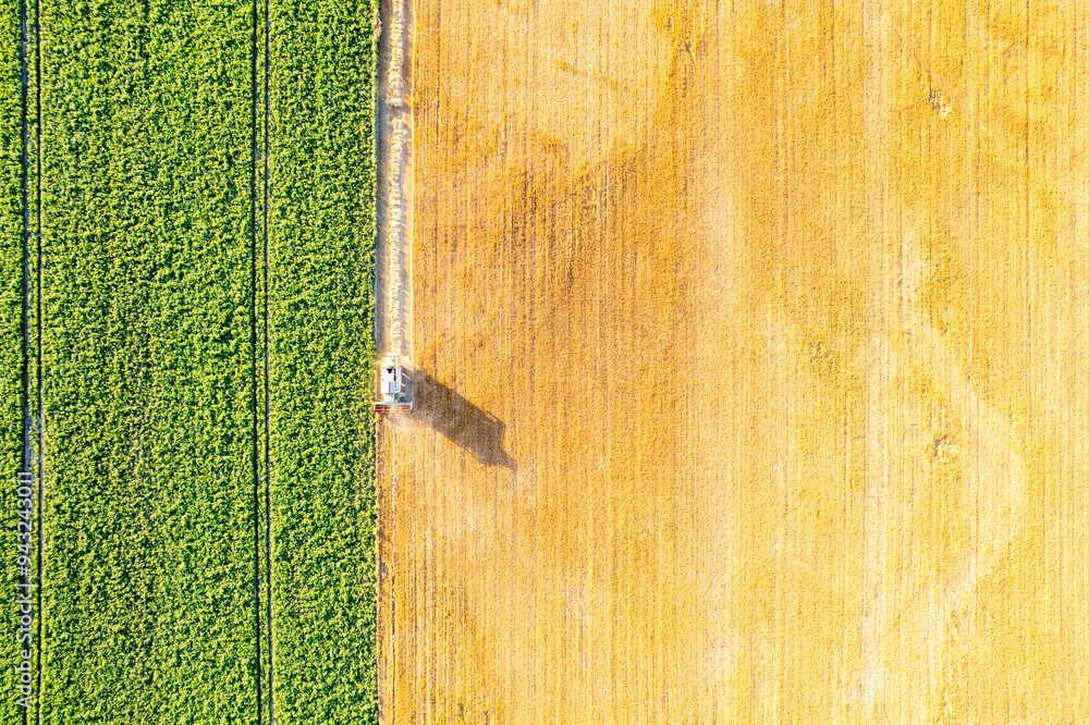 drone aerial zenithal view of a mower in a wheat field next to a potato field, agriculture concept