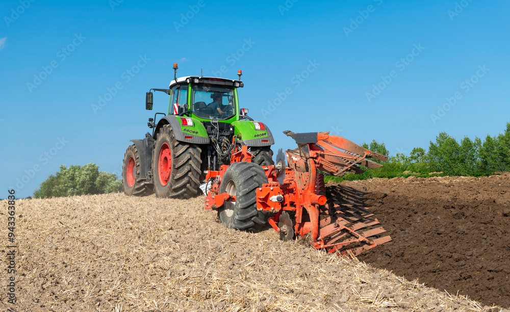 Tractor with 7-share reversible plow cultivating the field after the grain harvest - 2184
