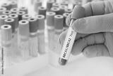 Doctor holding a test blood sample tube with BRCA1 and BRCA2 test on the background of medical test tubes with analyzes.