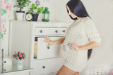 Pregnant girl at home is wearing sweater