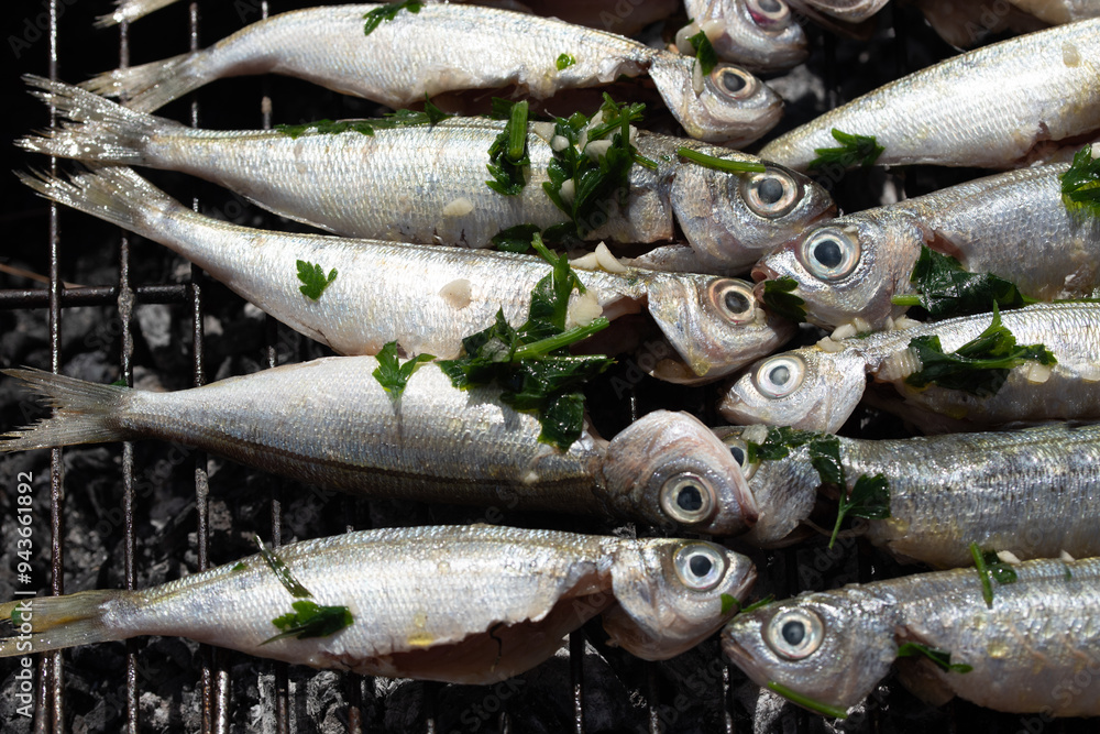 Small silver fish with scales lie on a charcoal grill. The fish are covered with garlic and parsley.