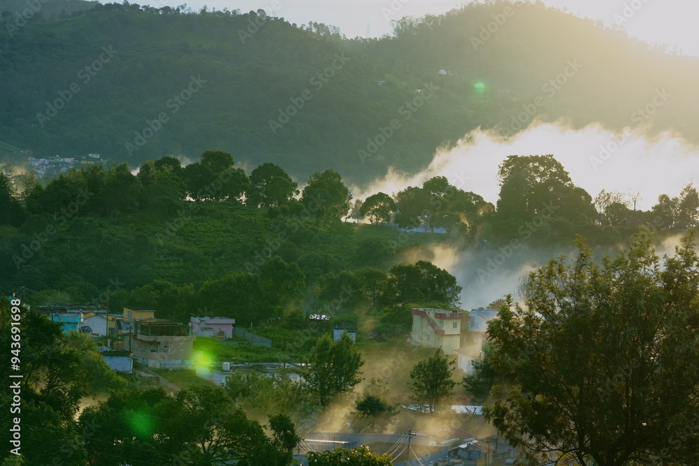 beautiful picture of Misty clouds passing over village in a valley over mountain