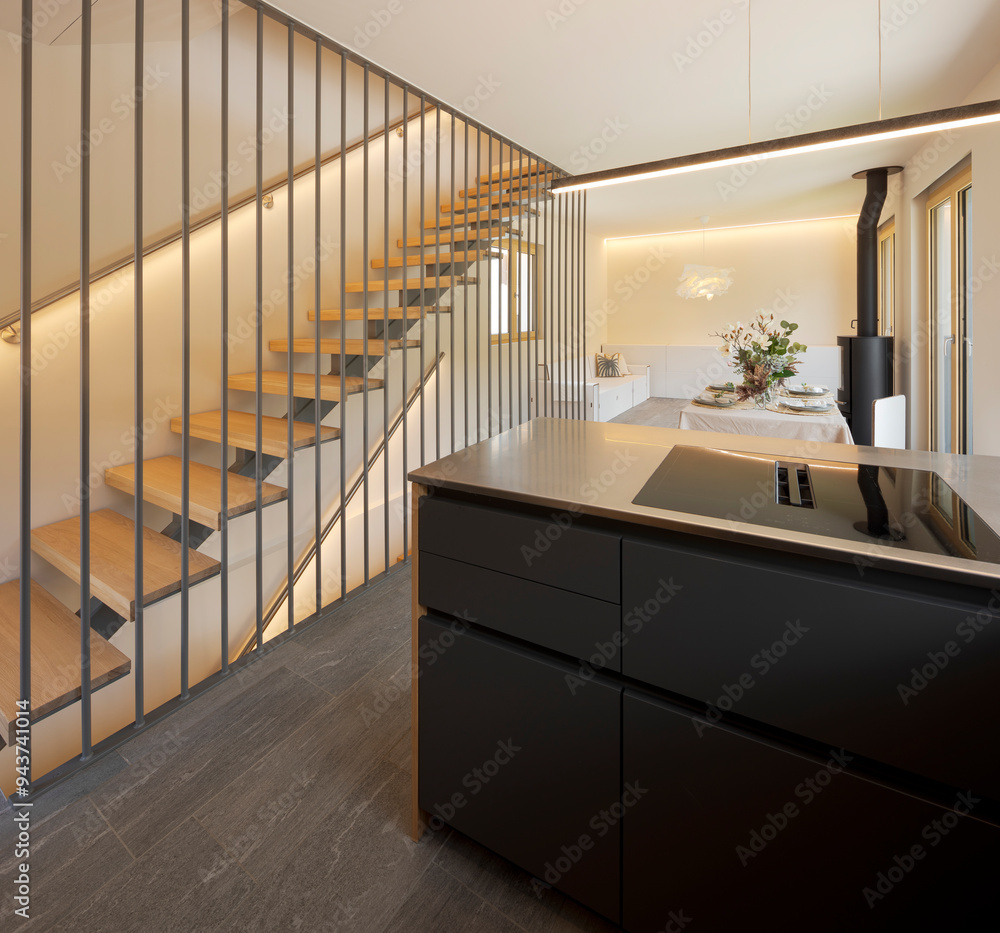 Open space with a kitchen island, a table and at the back the sofa and the stove. On the left a modern staircase in wood and metal.
