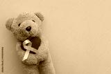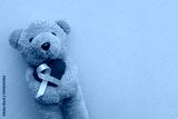 close up cute teddy bear with ribbon on beige background for representative of awareness of childhood cancer concept