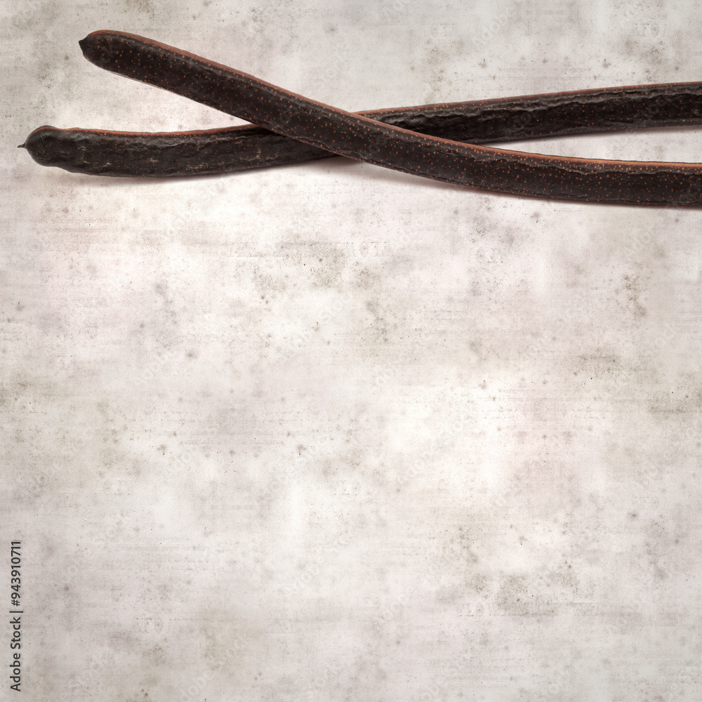 textured stylish old paper background, square, with long dark seedpods of Senna spectabilis, golden wonder tree