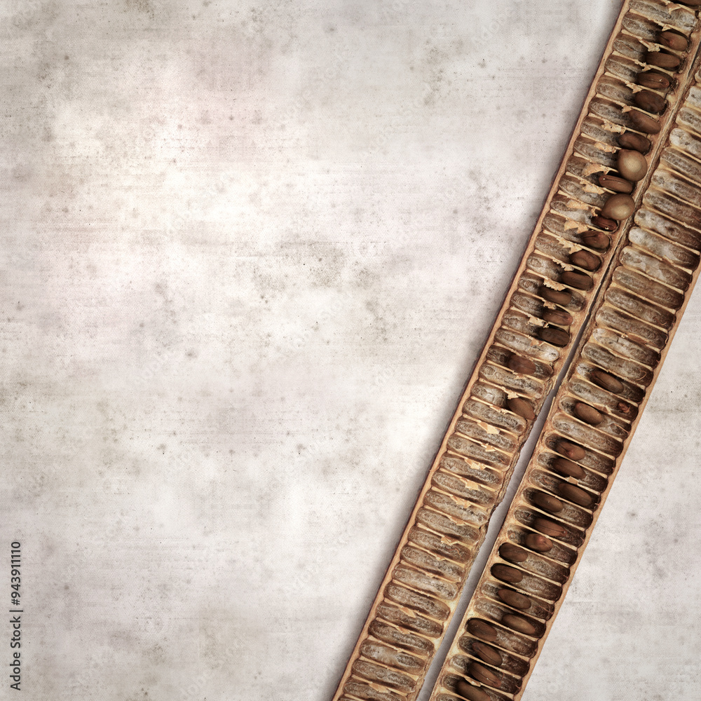 textured stylish old paper background, square, with long dark seedpods of Senna spectabilis, golden wonder tree