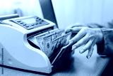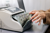 Close-up of dollar bills in an electronic money counting machine, ideal for illustrating financial services, cash management, or currency exchange.