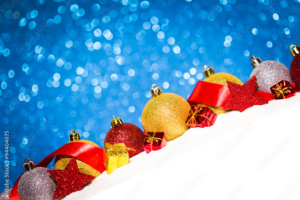 christmas ornament in snow on glitter background