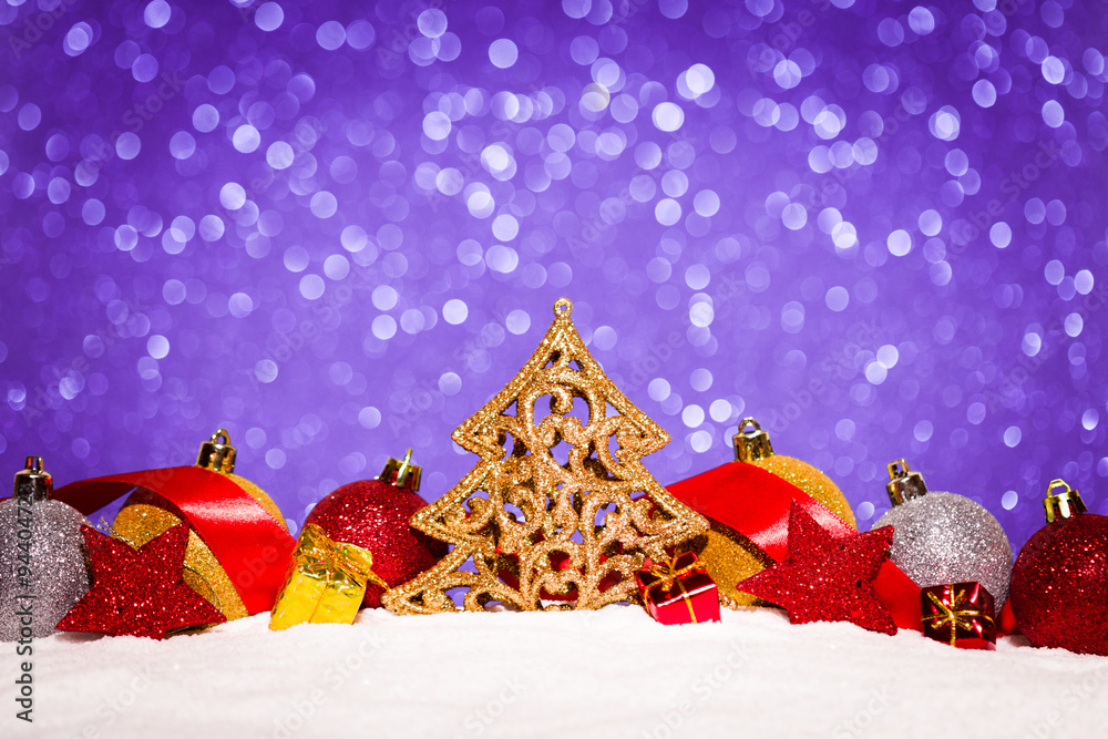 christmas ornament in snow on glitter background
