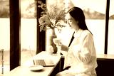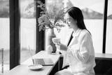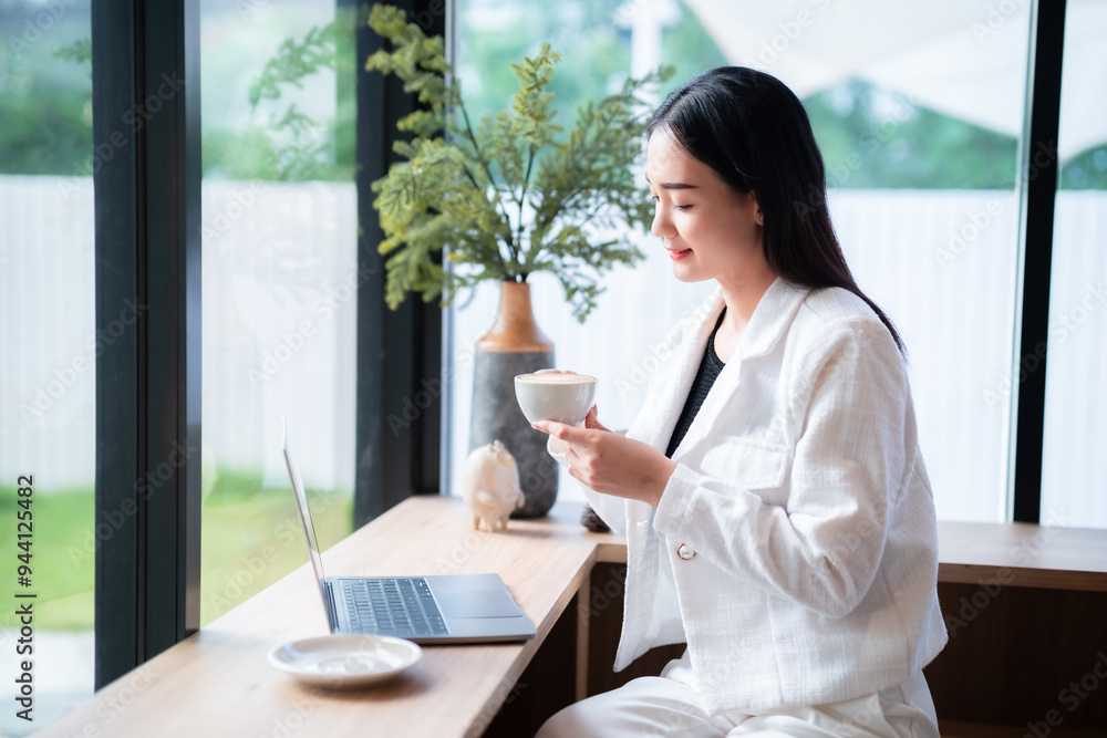 Portrait of beautiful happy Smiling of hands Holding cup mug of Hot coffee latte wits business female casual working with laptop computer in coffee shop like the background,communication concept