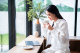 Portrait of beautiful happy Smiling of hands Holding cup mug of Hot coffee latte wits business female casual working with laptop computer in coffee shop like the background,communication concept
