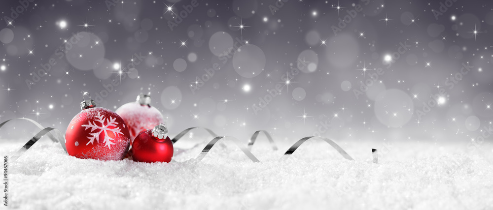 Red Baubles On Snow With Sparkling Stars On Silver Background