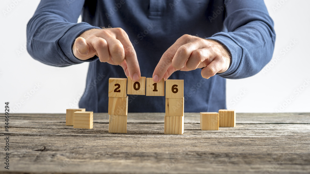 Person building a bridge of wooden cubes with the year 2016 sign