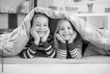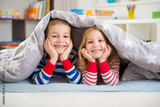Two happy children lying under blanket