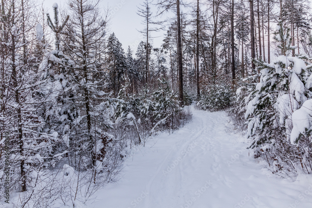 Winter view of a path in Prachovske skaly rocks in Cesky raj (Czech Paradise) region, Czech Republic