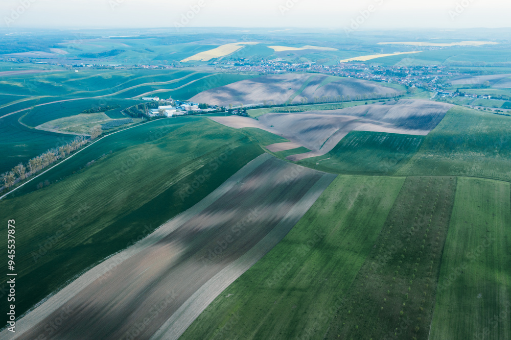 Aerial view of farmland with patchwork fields