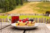 Berry tart and hot black tea cup on a wooden rustic table. Outdoor Breakfast in the mountain countryside, Tirol, Italy.