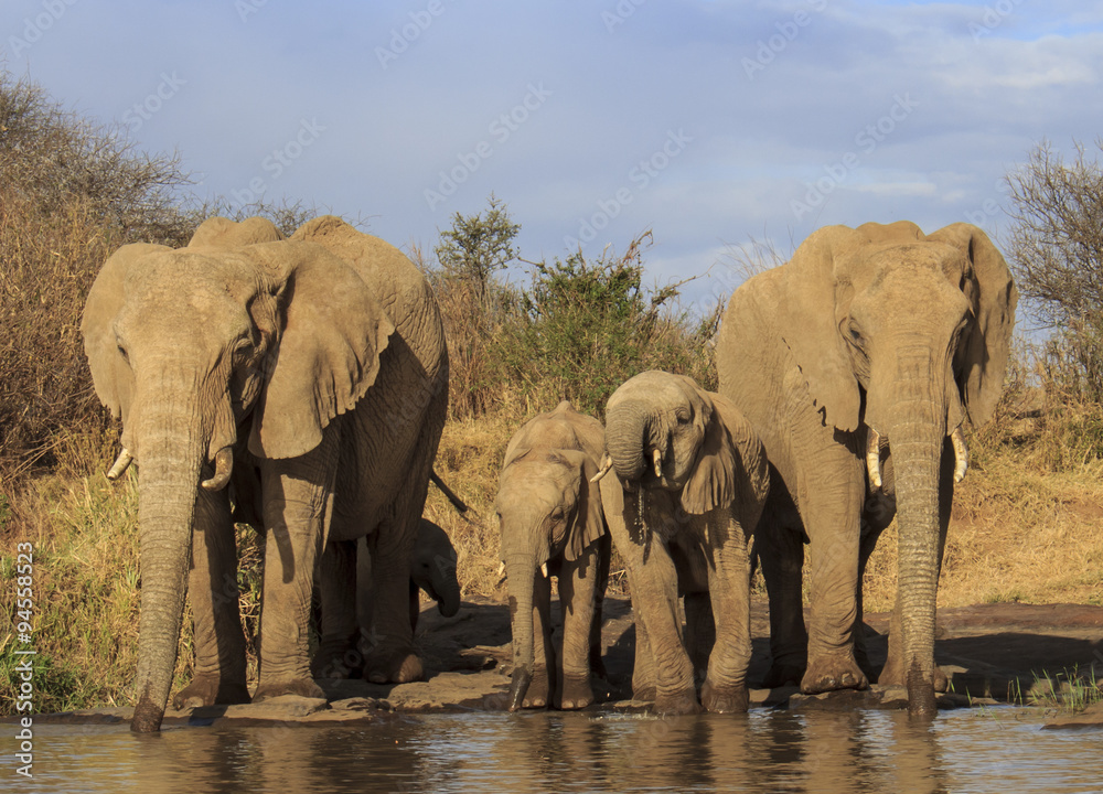 Herd African Elephant drinking at river