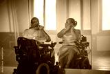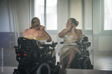 Young woman, a wheelchair dancer checking her look in a mirror at a dance studio before performance. Dancing with disability concept.
