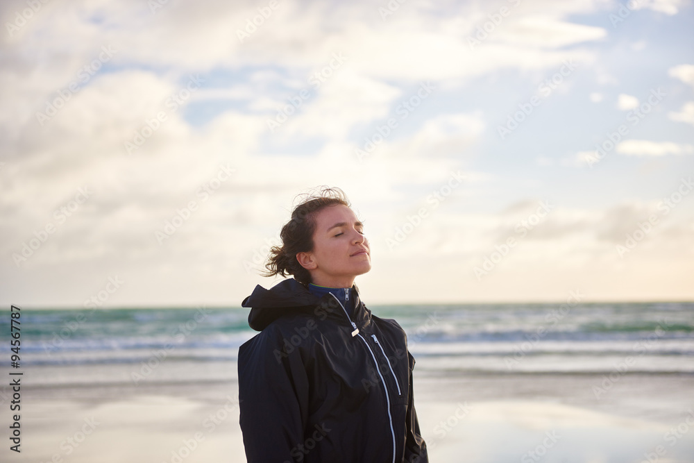 Woman enjoying fresh ocean air on a winter beach