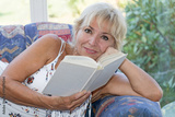 Attractive mature blond woman is reading a book