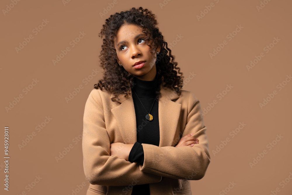 Bored upset african woman sighs, rolling eyes on beige. Teenager in displeasure