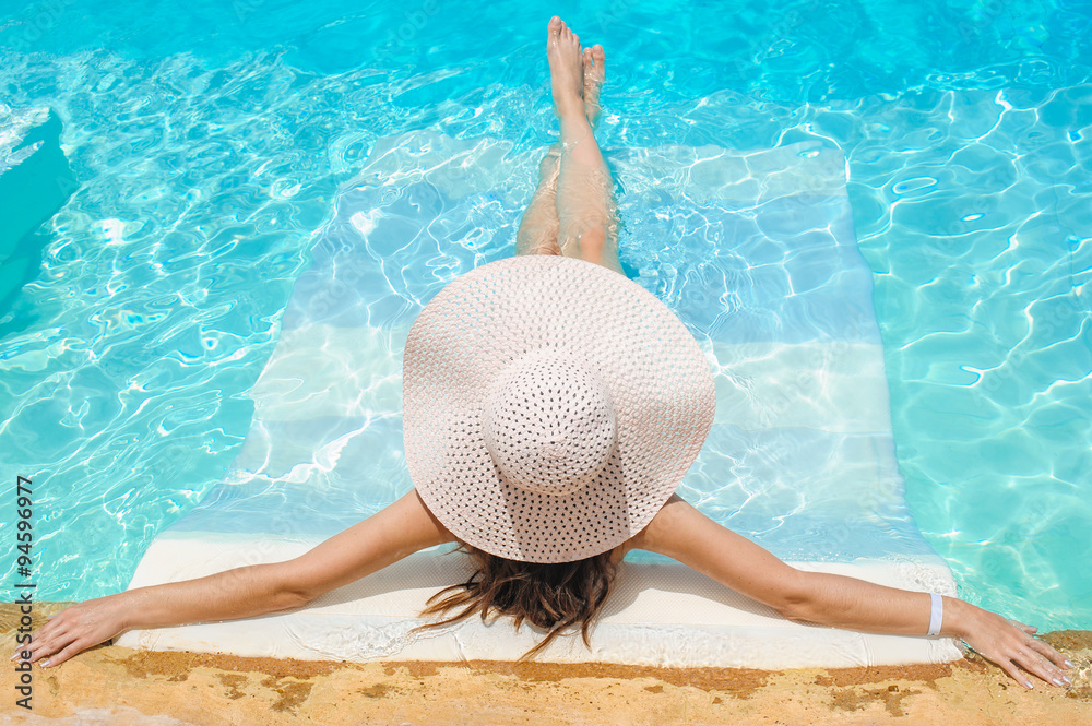 Woman in big whire hat relaxing on the swimming pool
