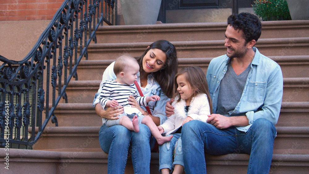 Family With Young Children Sitting Steps Outside Home On Urban Street In New York City USA