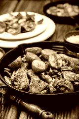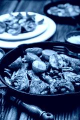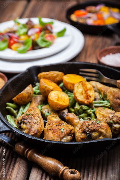 Chicken legs in pan with potatoes and salad