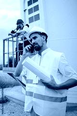 Vertical. Caucasian engineer talkin by cell phone holding a blueprint, at background a group of technicians working. One industrial contractor having a smartphone call speaking about the project