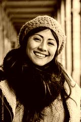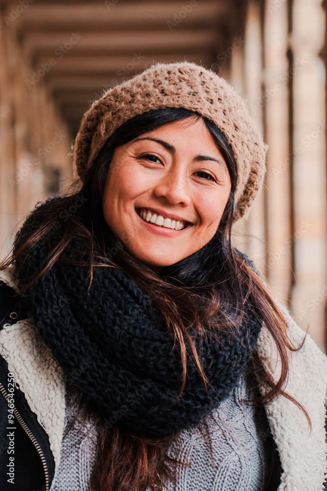 Vertical. Front view of asian young woman smiling with white perfect teeth and positive attitude. Close up portrait of one girl looking cheerful at camera standing outdoors in european street