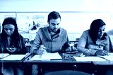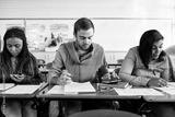 University, students and books with learning in classroom for tutorial notes, accounting test and math assignment. Study group, people and writing at college for education, scholarship and exam prep