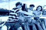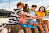 Smiling teenagers high school pupils friends classmates college students boys girls sitting on ramp skating in skate park spending good time summer holiday having fun give fist bump to each others