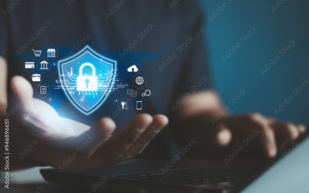 cyber security concept. Global network security technology protects business people personal information. Encryption with a padlock icon on the virtual interface. Cybersecurity or cybercrime threats.