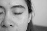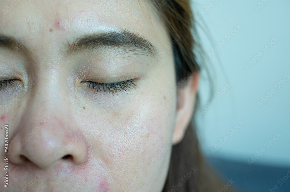 Close up of Asian woman face having freckles and enlarged pores problem on her skin.