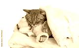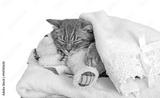 cute cat sleeping on a white fluffy towel