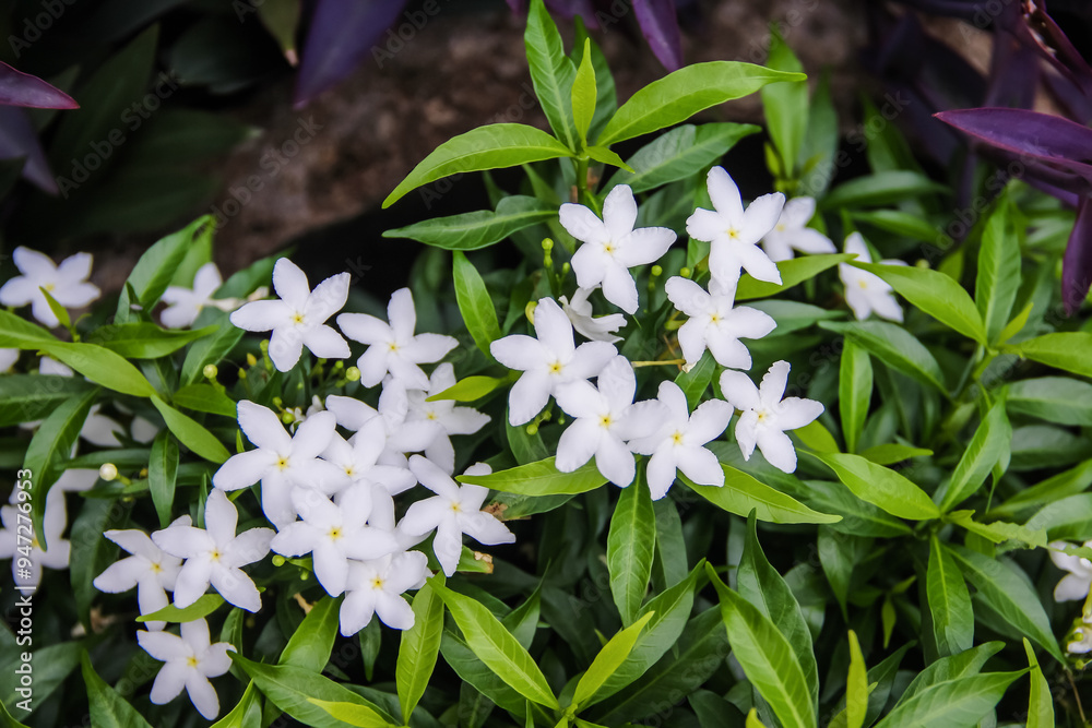 Top view white sampaguita jasmine officinale blossom blooming in garden summer scenic green leaf fence background